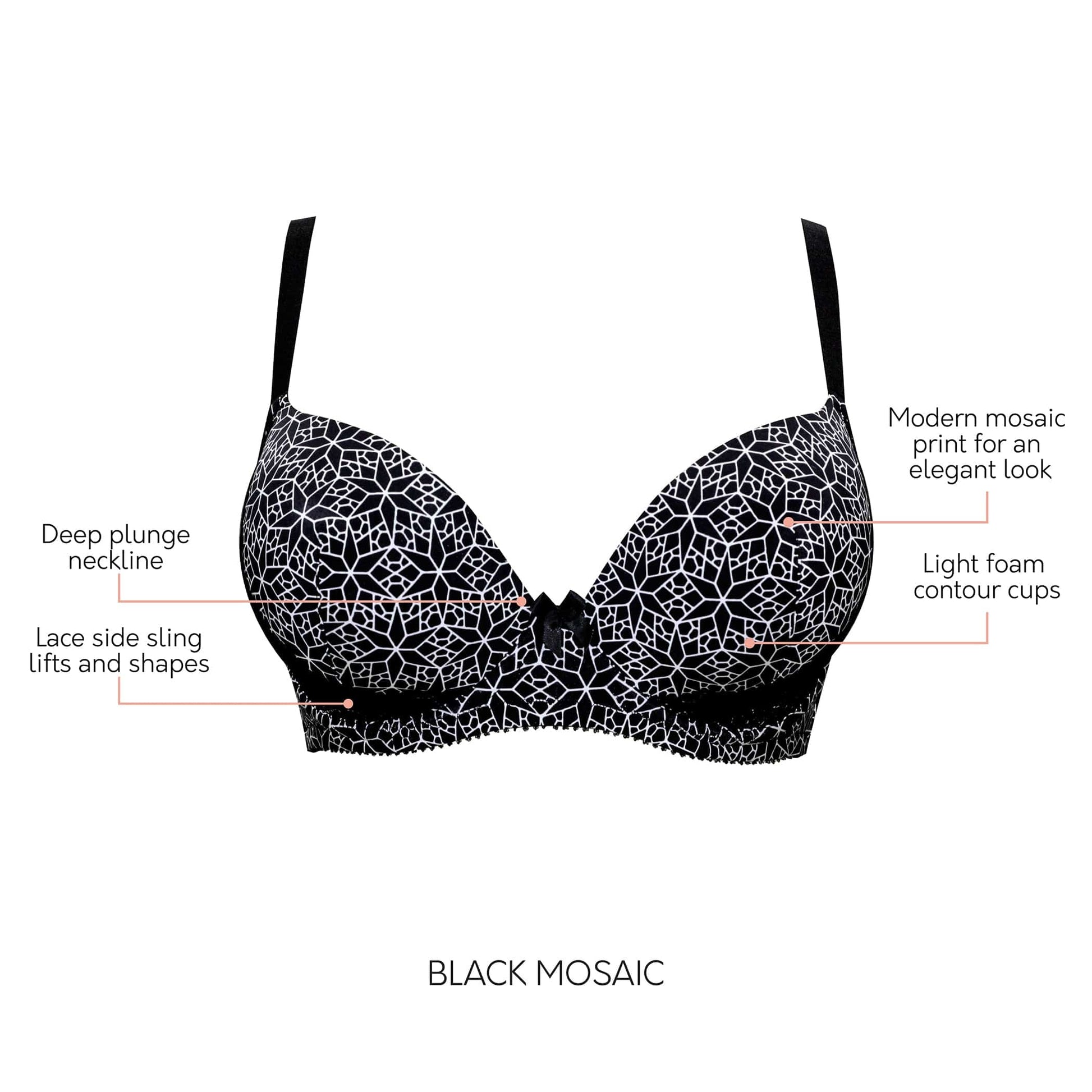Our favorite T-shirt bra now available in a modern mosaic print! Casey features a deep plunge and light foam contour cups. The pretty lace sling helps provide extra support and lift for full busted and full figured woman.