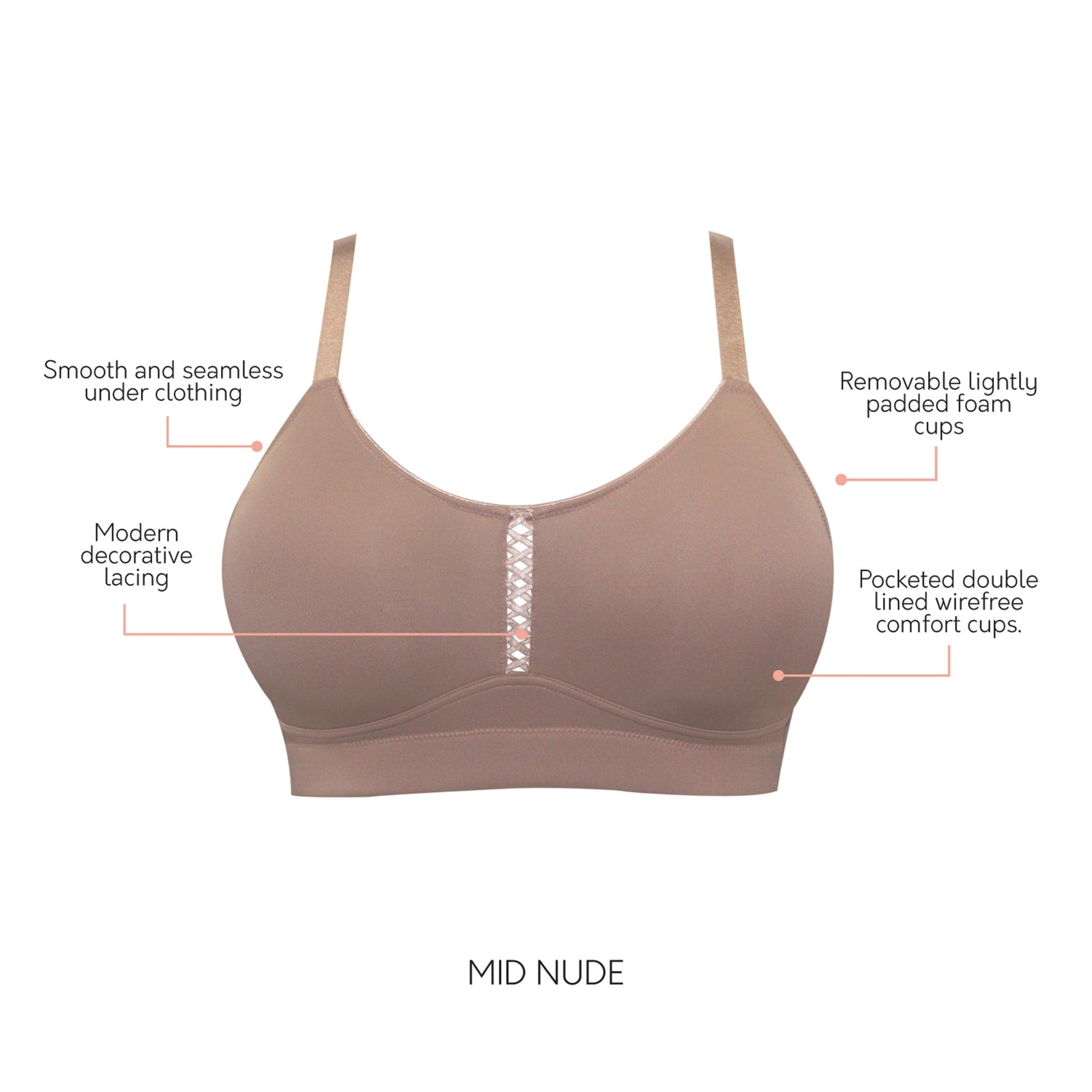 • Pocketed, double lined, wire-free comfort cups