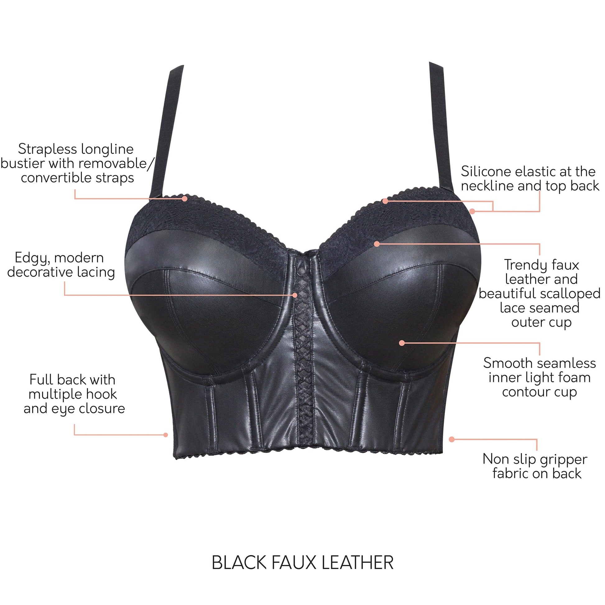 Stevie is a chic, stylish, sexy, strapless longline bustier inspired by leather and lace. The on-trend faux leather is accented with our beautiful, scalloped Mia lace combined with edgy lacing, making this innovative new style an eye-catching, must-have wardrobe staple. Designed with the same fit features as our best-selling Elissa Bustier with silicone elastic at the neckline, full back with multiple hook & eye closure, and non-slip gripper fabric on the back providing the ultimate strapless support, especially for full figured and full busted women. Get the look with Stevie -- available in size inclusive hybrid sizing S-3X Plus, offering the perfect fit for every body.